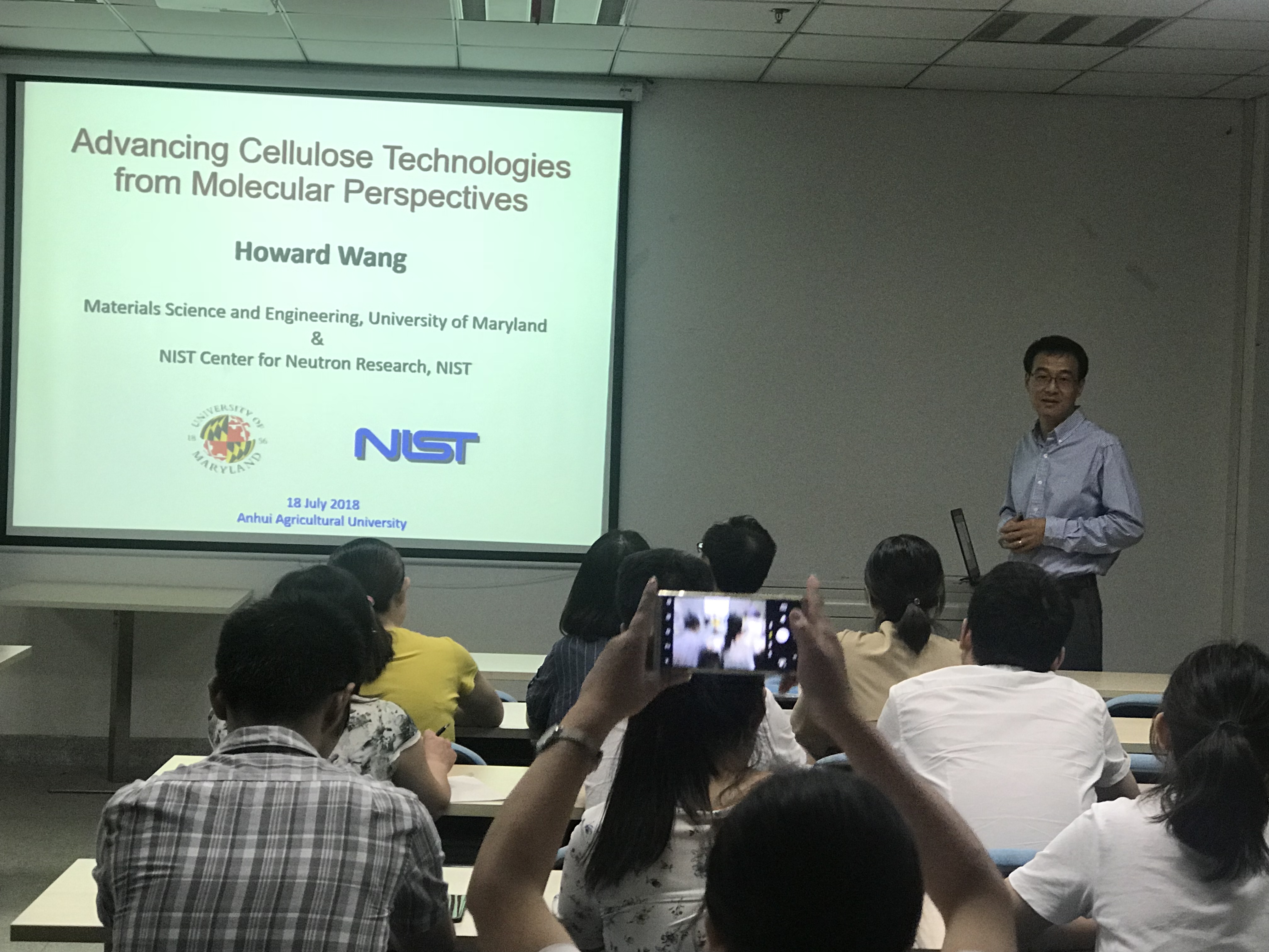 应安徽农业大学生物质分子工程中心邀请,马里兰大学王浩教授及西北工业大学闫毅教授分别作了题为《Advancing Cellulosic Technologies from Molecular Perspectives》,《有机修饰的多金属氧簇:一类新的有机金属聚合物构筑基元》的学术报告,相关学科老师和研究生共计30余人参加了报告会。报告会由林学院副院长徐斌及唐传兵教授主持,会后进行深切交流并参观了我院各个实验室。