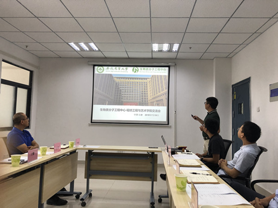 应生物质分子工程中心的邀请,轻纺工程与艺术学院杜兆芳院长率学院老师13人于2019年7月15日上午来中心进行交流会谈,中心执行主任汪钟凯以及中心其他8位老师参加了交流会。