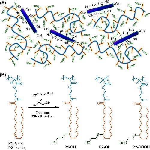 文中报导了通过超分子方法由大豆油(SO)及纤维素纳米晶(CNCs)制备具有刺激响应行为和较高机械强度的生物基高分子纳米复合材料的研究工作。在复合体系中,从SO获得的聚合物基质通过点击化学反应被修饰以羟基基团与羧基基团,这些基团与CNCs间形成较强的氢键作用,有效提升了纳米复合材料体系中基质与填料的相容性。制备得到的纳米复合材料表现出较高的拉伸强度,其储能模量在200℃的高温下仍然能够维持稳定。此外,这些纳米复合材料的机械强度显示出对水的快速可逆刺激响应,从而可实现利用外部刺激调节复合体系中的分子间氢键作用。