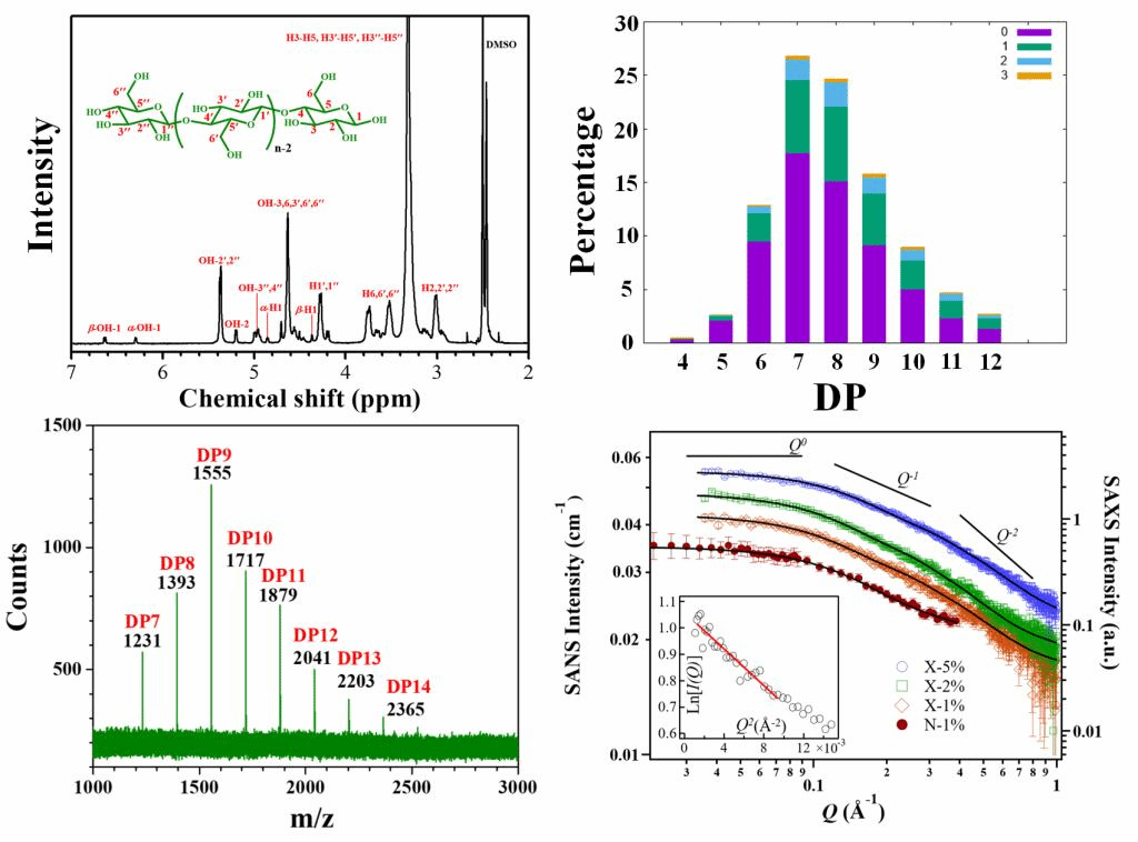 纤维素作为可再生资源,是地球上含量最多、分布最广的生物质材料。在我们的日常生活中,纤维素具有广泛的应用场景,涵盖人类活动的方方面面,在前沿科学中也有很多潜在的应用。然而,由于纤维素结构复杂,分子内与分子间充斥着大量的氢键,具有复杂的聚集态结构,一些物理和化学方面的性质还有待揭示。因此,可以将分子量较低的纤维低聚糖作为模型化合物,通过化学和物理的方法进行研究,揭示聚合度较高的纤维素特殊的物理化学性质。低聚糖是单糖通过糖苷键连接而成的聚合度较低的寡聚物,主要分为普通和功能性低聚糖两大类。普通低聚糖在人体内会被消化吸收并转化为血糖,如蔗糖、乳糖和麦芽糖等。功能低聚糖有纤维低聚糖、低聚木糖和低聚异麦芽糖等,这一类低聚糖虽然具有甜味,但是不会被人体内的胃酸、胃酶降解,也不会在小肠被吸收,可到达大肠部。功能性低聚糖具有很多的功效,可以降低肠道的pH值、提高人体的免疫力、促进人体对矿物质的吸收,以及抑制有害菌群。纤维低聚糖通常由不超过10个葡萄糖结构单元组成,可以通过纤维素降解的方式获得,主要包括酶解、碱解和酸解这三种方式。对于聚合度可控的产品,酶解和酸解被认为是较为可行的方法,前者可用于工业化生产水溶性葡萄糖、纤维二糖或纤维四糖,后者适用于生产具有可控聚合度的纤维低聚糖。与自然界中高聚合度的纤维素不同,纤维低聚糖具有较好的溶解性,可以作为模型化合物研究。如何获得获得聚合度(DP)为5~12的纤维低聚糖具有重要的科学和应用价值。本研究利用磷酸在室温下水解微晶纤维素制备了具有窄分子量分布的纤维低聚糖。结合红外分析、核磁共振、飞行时间质谱、小角X-射线散射和小角中子散射等一系列表征方法对获得的纤维低聚糖进行研究,揭示了其化学结构、晶型、分子量、分子量分布、碳原子丰度以及在溶液中的形态。该研究为纤维低聚糖的表征提供了新的思路,可以促进纤维低聚糖基材料及其衍生物的进一步发展。