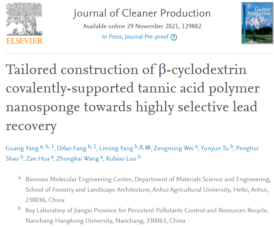 实现重金属的高选择性回收不仅可有效减轻土壤中的重金属污染,而且是实现废弃重金属资源化的重要保证。如何实现吸附剂具有高吸附量的同时,保持高选择性仍然具有很大的挑战。很多树木在生长的过程中可以选择性富集一些重金属,其主要原因之一是树木体内的一些组成成份可以选择性与重金属离子结合。受此启发,安徽农业大学杨光教授课题组与南昌航空大学合作将树木中的单宁酸与环糊精进行交联,构建了一类新型纳米海绵材料。研究发现该纳米海绵可以对土壤污染物之一的铅离子(Pb2+)进行高效吸附(136.8 mg g-1, 3分钟内完成超过80%的吸收)的同时,保持超高的选择性(与其他常见重金属离子相比,选择性系数高达1143)。通过实验和理论计算发现单宁酸中酚羟基与Pb2+的结合能最大。最后,通过固定床实验发现所设计构建的纳米海绵不仅可以保持很好的稳定性、抗干扰性以及重复利用性,而且通过经济核算发现该材料具有很高的经济价值。相关研究发表在国际环境与生态领域的权威期刊 Journal of Cleaner Production(中科院一区,影响因子 9.2) 上。