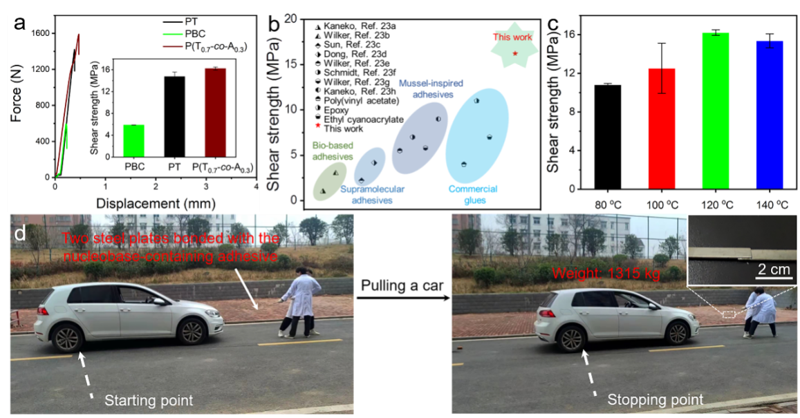 该工作以蓖麻油裂解得到的十一烯酸甲酯为原料,合成含核酸碱基侧的长链烷基单体,然后采用高效的巯基-烯点击聚合(图1),并合理调控聚合物中互补碱基之间超分子氢键密度和位置,制备出含有分子间和分子内互补氢键的共聚高分子,韧性和杨氏模量分别高达73.8MJ/m3和234.2 MPa,与只含有一种核碱基聚合物相比大约增加了一倍。该共聚物不仅拥有优异的力学性能,还具有核碱基独特的粘附性。对于接触面积为1.0 cm2的两块钢板,剪切力高达1600 N,优于两种对照聚合物(图2)。将共聚物粘接在接触面积仅为1cm2的钢板间可轻松拉动1.3吨的小轿车,展现了超强粘结性能。