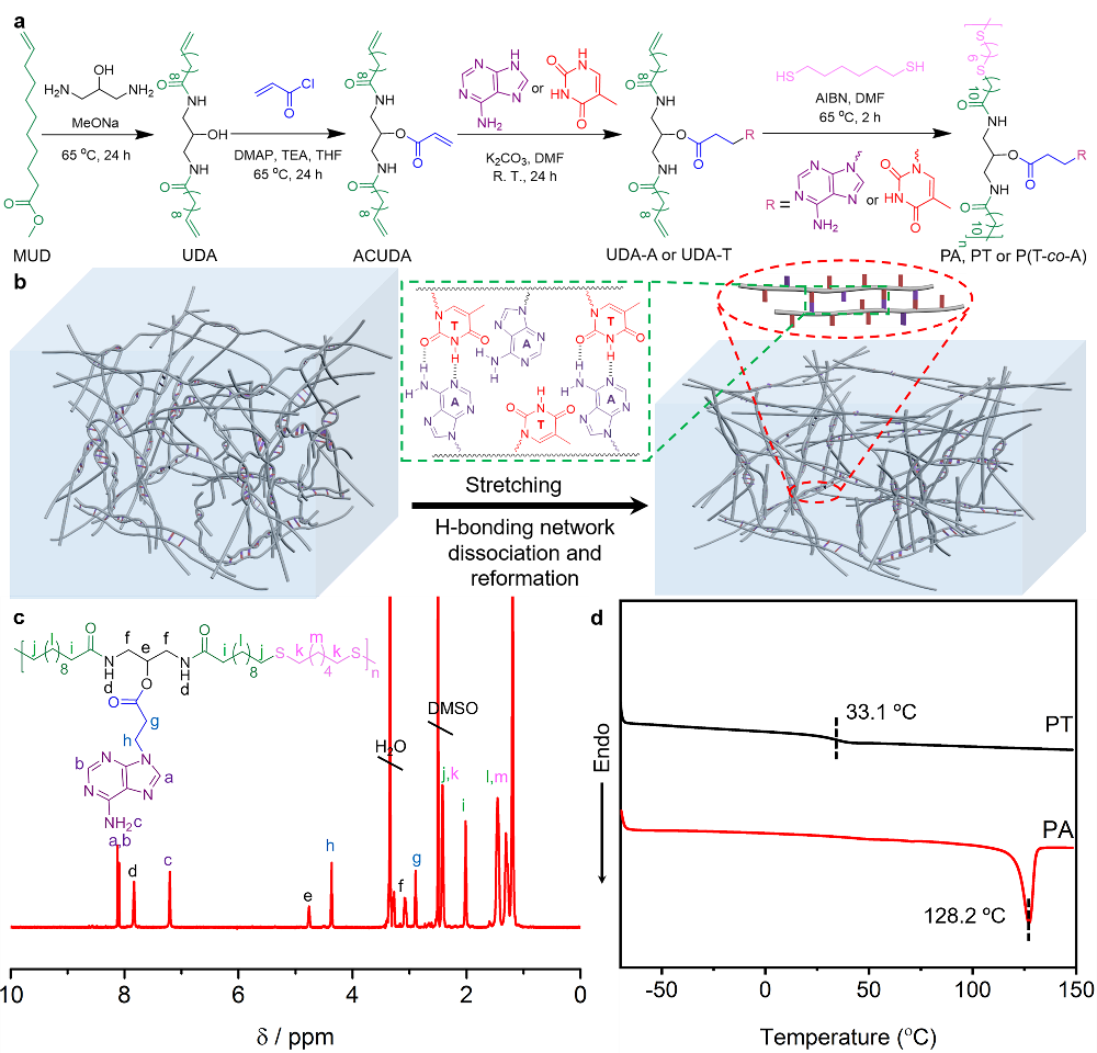 近日,国际高水平期刊Advanced Functional Materials(中科院一区,IF =18.808)在线发表了中心华赞副教授题为 “Rational Design of Bioinspired Nucleobase-Containing Polymers as Tough Bioplastics and Ultra-Strong Adhesives”的研究论文。该研究将核酸碱基互补氢键相互作用,引入到长链烷烃聚合物中,开发出具有优异韧性和超强粘附性能的含核酸碱基聚合物材料(图1)。研究发现同时具有分子间和分子内特异性识别互补氢键的核碱基共聚物表现出优异的能量耗散、韧性和超强粘附性。核碱基独特的界面粘附性使该聚合物材料具有高达16.2 MPa的超高粘接强度。