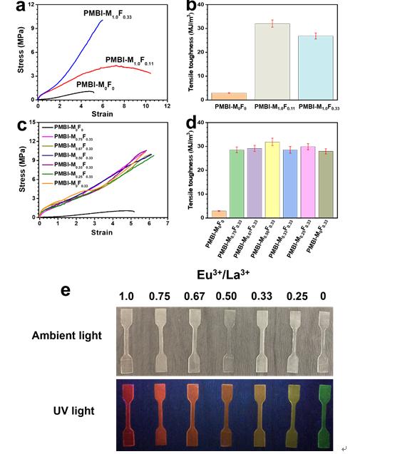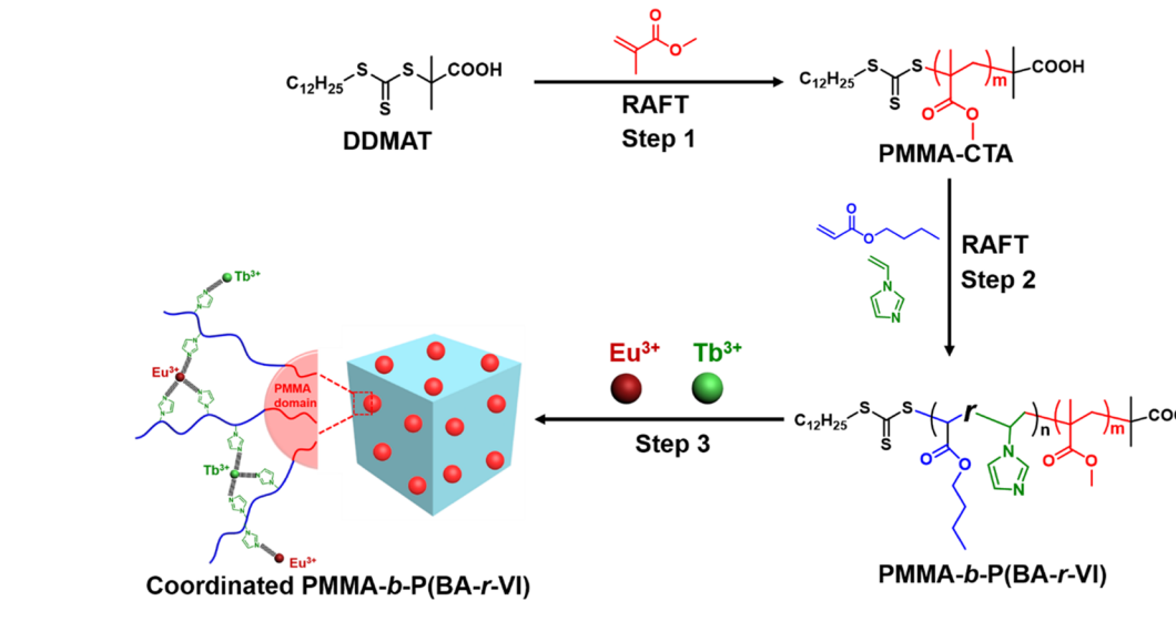 在这项工作中,如图1所示,研究者通过RAFT聚合合成了聚甲基丙烯酸甲酯-b-聚(丙烯酸正丁酯-r-1-乙烯基咪唑)这样一个两嵌段聚合物作为模型聚合物(PMMA-b-P(BA-r-VI)),在这个聚合物中玻璃化转变温度较高的PMMA可以与软段基体发生微相分离,而软段中引入的咪唑基团可以与稀土离子发生络合形成超分子网络结构。选用可以发红色荧光的铕离子(Eu3+)和发绿色荧光的铽离子(Tb3+)与咪唑基团进行配位,通过调节两种离子之间的比例得到具有不同力学和荧光性能的基于两嵌段聚合物的弹性体材料(见图2)。引入稀土离子与两嵌段聚合物中的咪唑基团进行配位后,可以显著提高材料的强度和韧性,并且不会降低其延展性和弹性。这些弹性体具有典型的微相分离结构,PMMA可以在基体中形成纳米微球为材料提供强度。在拉伸过程中,这些PMMA纳米微区可以沿着拉伸方向进行取向,并且这种取向是可回复的。这种制备基于两嵌段聚合物的高强度荧光弹性体的方法可以进一步应用至其它拓扑结构的聚合物体系。