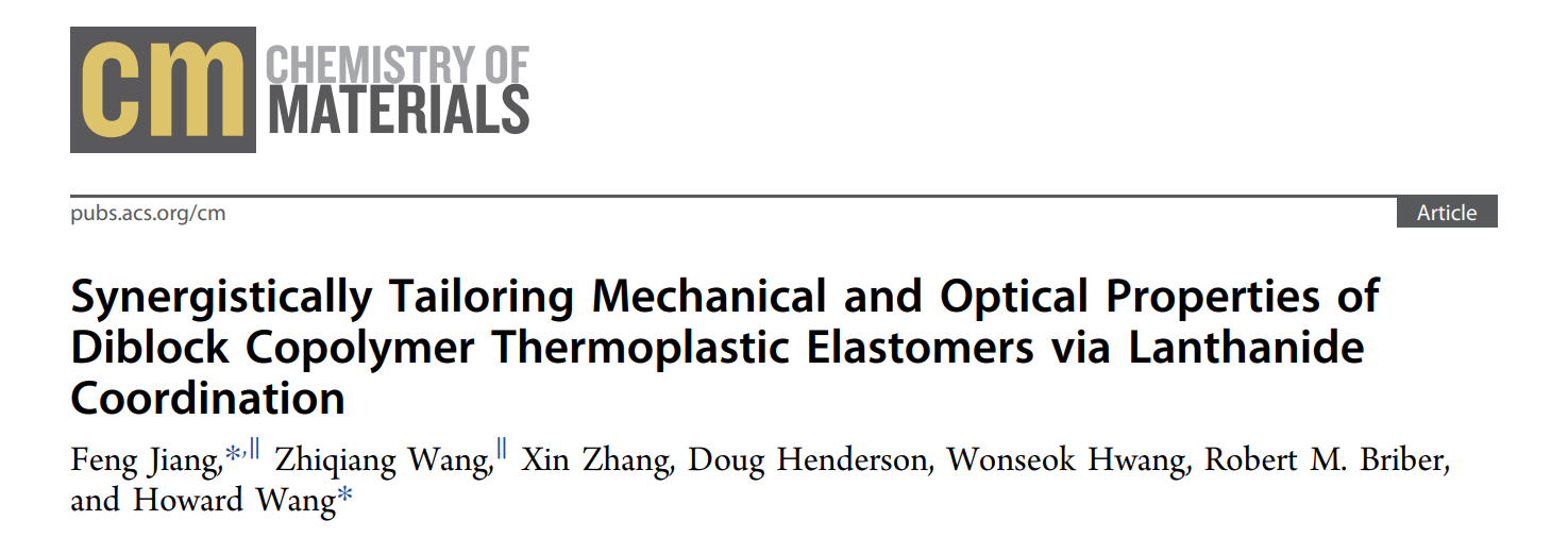 近日,安徽农业大学生物质分子工程中心蒋峰副教授与马里兰大学王浩教授通过可逆加成-断裂链转移(RAFT)聚合和稀土配位的方法,构建了一系列具有优异力学性能和荧光性能的两嵌段弹性体材料。通过控制软硬段之间的分子量以及稀土离子比例可以高效控制弹性体材料的强度、韧性以及多变的荧光性能。通过稀土配位,两嵌段弹性体的拉伸强度最高可达10.6 MPa,拉伸韧性可达32 MJ/m3,并且在紫外光照下材料可以在红色和绿色荧光之间进行有效的调控。通过原位小角X-射线散射(SAXS)实验研究了这种两嵌段荧光弹性体在不同拉伸过程中的结构演化,揭示了其在拉伸和回复过程中硬段相聚集体之间的距离变化。相关工作以“Synergistically Tailoring Mechanical and Optical Properties of Diblock Copolymer Thermoplastic Elastomers via Lanthanide Coordination”为题发表于权威期刊Chemistry of Materials(中科院一区,影响因子9.811),其中安徽农业大学的硕士研究生王志强为论文的共同第一作者。