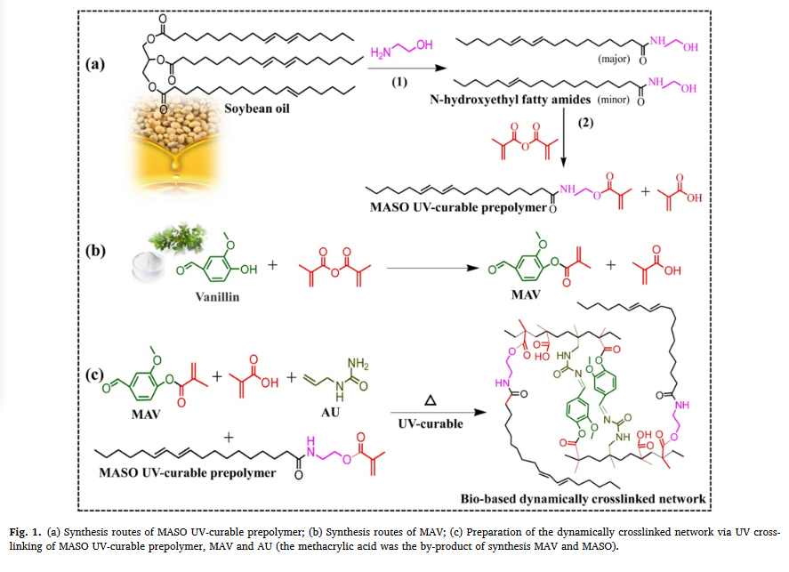 Polymers with repairability driven by multiple stimuli and its functional composite materials are desired for practical applications. However, to date, study on dynamically crosslinked networks with multi-stimuli response or multichannel self-healing ability derived from green, renewable precursors has been rarely reported. Herein, bio-based dynamically crosslinked network based on Schiff base (dynamic imine bonds) and multiple hydrogen bonds were fabricated from soybean oil and vanillin. The reprocessing and self-healing properties could be customized by varying the ratio of methacrylation of the obtained fatty amide (MASO) UV-curable prepolymer and methacrylate functionalized vanillin (MAV). The introduction of Schiff base and hydrogen bonds endowed reprocessability for the material. Moreover, the resulting bio-based dynamically crosslinked network exhibited outstanding self-healing performance stimulated by heat, organic solvent, infrared radiation, and microwave. The bio-based composites with Fe3O4 nanoparticles were also investigated to realize non-contact welding