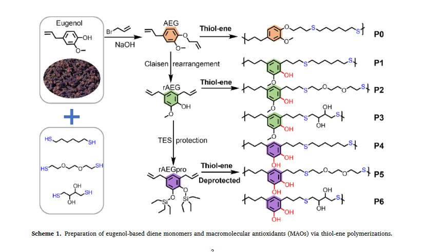 A series of linear macromolecular antioxidants (MAOs) with main-chain phenol or catechol groups were successfully prepared using eugenol as a renewable